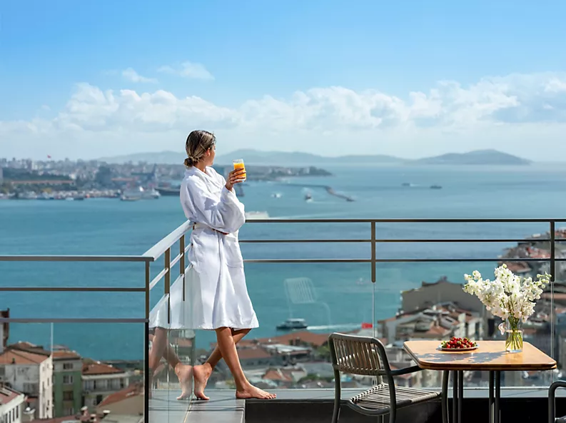 - Daarnaast is er ook een rooftopbar met buitenzwembad met panoramisch zicht op de skyline van Istanbul en de Bosphorus.
